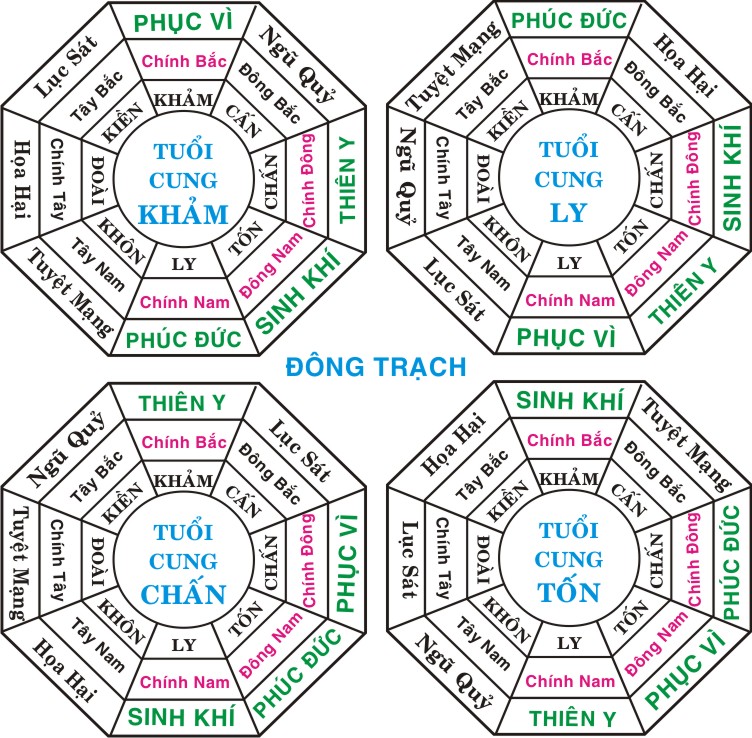 Theo phong thủy học Bát Cung bao gồm: Sinh Khí, Thiên Y, Diên Niên, Phục Vị là 4 cung tốt, và 4 cung xấu bao gồm: Tuyệt Mệnh, Ngũ Quỹ, Lục Sát và Họa Hại.